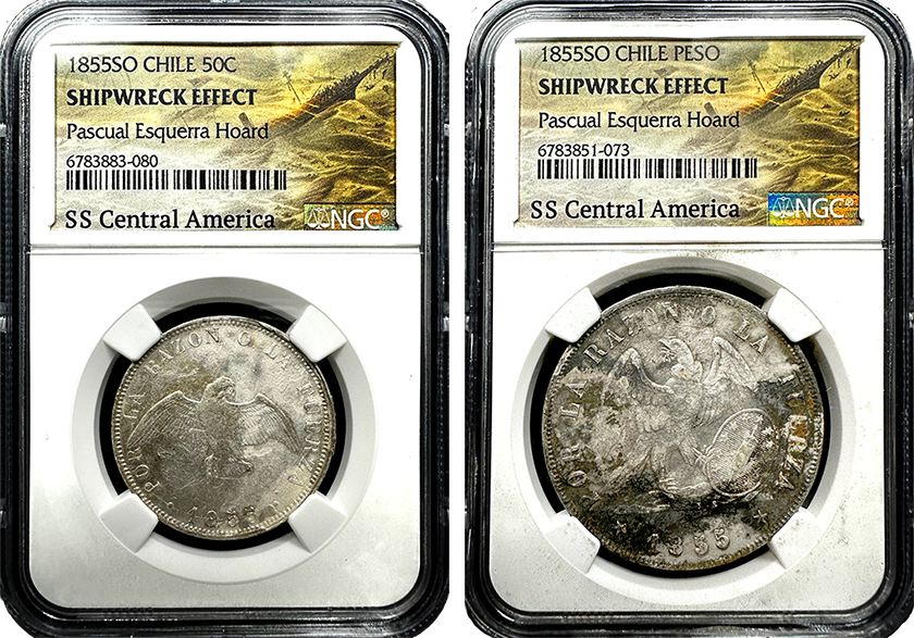 We are pleased to offer the following silver coins salvaged from the shipwreck that are traced back to a singular passenger, Mr. Pascual Esquerra, a Chilean and Spanish businessman who lost his life that day. Each coin has been certified and pedigreed by NGC with a shipwreck effect grade along with a special label and a pedigree to Esquerra.