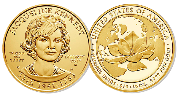 The obverse features a portrait of Jacqueline Kennedy and the reverse depicts the magnolia flower that Mrs. Kennedy chose to be planted in the White House garden near the eternal flame of her husband's grave in Arlington National Cemetery.