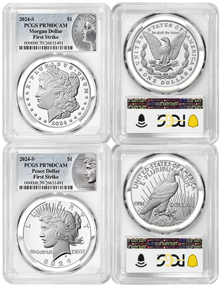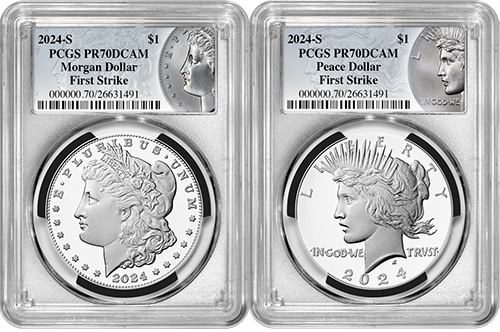 The word “proof” refers to a specialized minting process that creates a coin with a stunning two-tone finish featuring a highly reflective background contrasted with frosted, matte design features. The already popular 2024 Morgan and Peace Silver Dollar Series is now available in this equally popular proof finish, which PCGS graded as Perfect-70s.