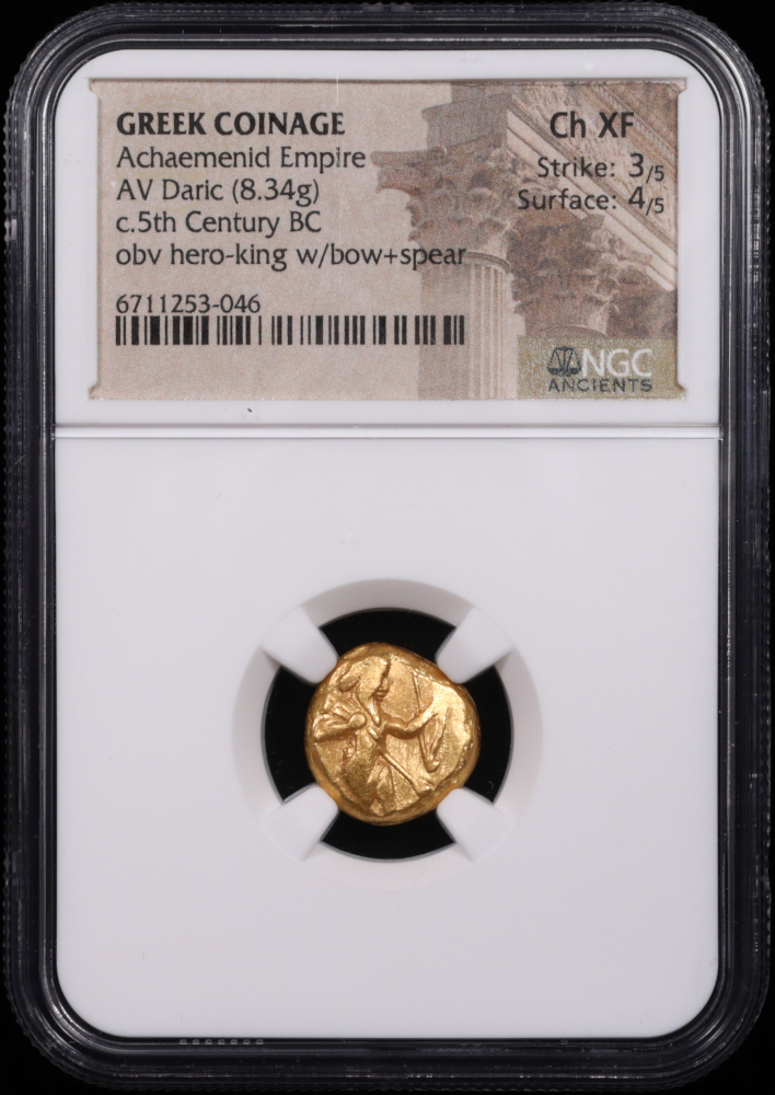The Achaemenid Gold Daric from the 5th-4th centuries BC, is a numismatic treasure that takes us back to the splendor of the mighty Persian Empire. Weighing 8.34 grams, this gold daric features an enigmatic hero-king armed with a bow and spear on the obverse and an incuse punch on the reverse. In Choice Extremely Fine condition, with a Strike rating of 3/5 and a Surface rating of 4/5, this coin echoes the majesty of a once-great empire. This particular coin has incredible design details compared to most on the market.