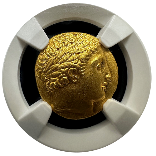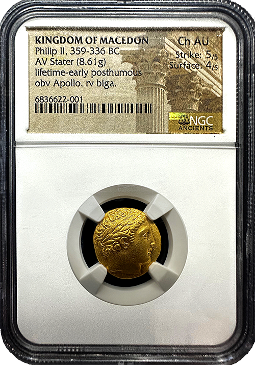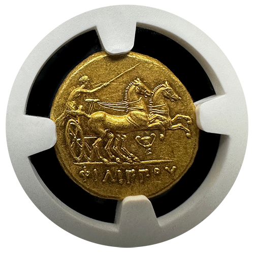 This extraordinary Gold Stater from the Kingdom of Macedon, minted during the lifetime and early posthumous period of Philip II (359-336 BC), is a remarkable piece of ancient history. Weighing 8.61 grams, this coin is certified by NGC Ancients in Choice About Uncirculated condition, with a Strike rating of 5/5 and a Surface rating of 4/5.