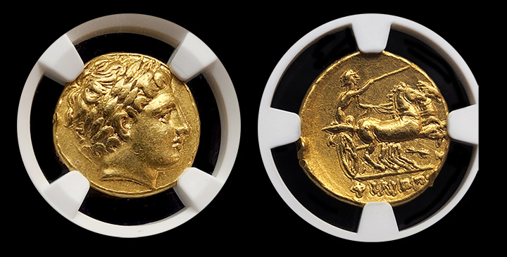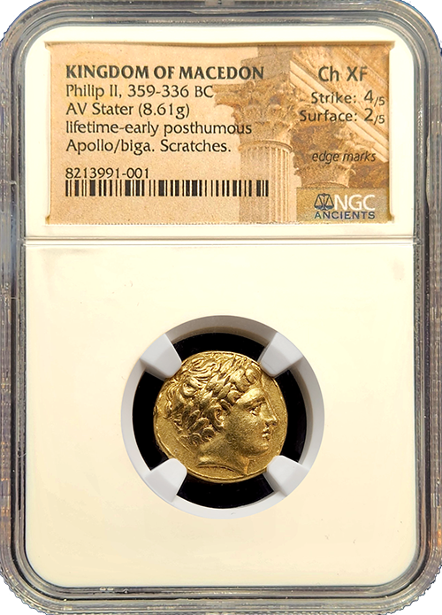 This exceptional Gold Stater of Philip II of Macedon struck during his lifetime or shortly after his death (359-336 BC), is a rare and historically significant artifact from one of the most powerful rulers of the ancient world. Weighing 8.61 grams and certified by NGC Ancients as Choice Extremely Fine (Strike 4/5, Surface 2/5), this coin remains an outstanding representation of Macedonian artistry and prestige.