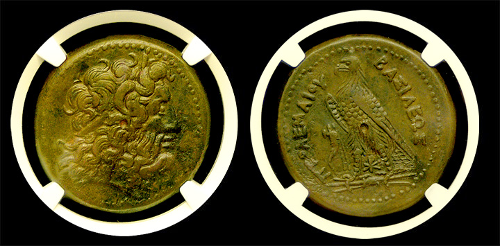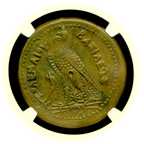Outstanding coin in terms of size that depicts Zeus on the obverse and a perched eagle on the reverse. Weighing well over an ounce of pure bronze, this 2,200 year old Egyptian coin is an impressive one and is very nice for the assigned grade.