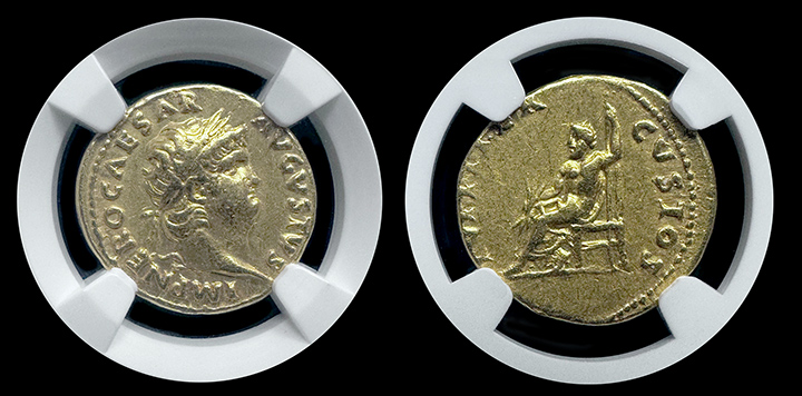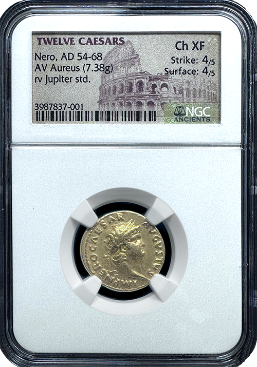 Certified by NGC in Choice Extremely Fine, with a Strike grade of 4/5 and Surface grade of 4/5, this aureus remains a tangible link to a pivotal chapter of Roman history. As part of the highly sought-after Twelve Caesars Collection, it is appealing to advanced Roman gold collectors.