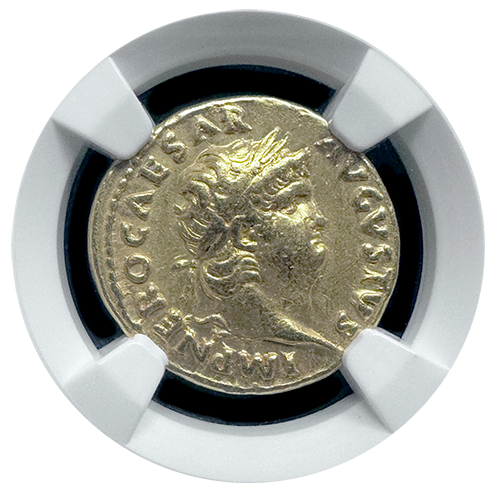 This impressive gold aureus was issued under Nero, the last emperor of the Julio-Claudian dynasty. Ascending the throne at a young age, Nero’s reign is one of the most infamous in Roman history, remembered for both cultural patronage and political turmoil. Despite his controversial legacy, coins from his era stand as enduring witnesses to the grandeur of Rome.