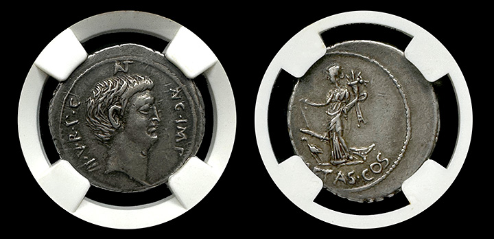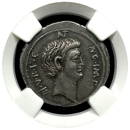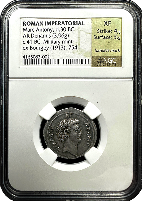 This coin has an intriguing provenance, as it was part of the Bourgey collection in 1913 (reference 754). Owning this authentic piece of history allows you to connect with the fascinating past of Marc Antony and the political landscape of his time. This is the ONLY example of this particular issue we can find any reference of and it is a beautifully toned, fully original specimen. Truly museum quality in all regards.