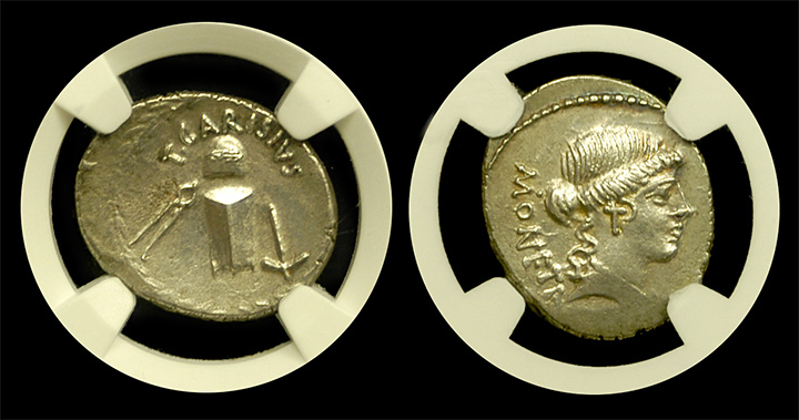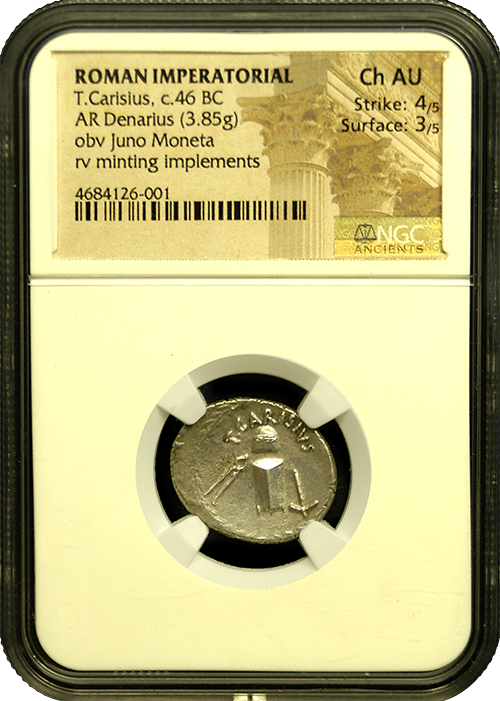 Roman Imperiatorial Denarius of T. Carisius c 46BC Ch. About Uncirculated