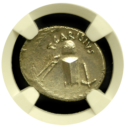 Extremely rare in any condition, particularly so fine—this denarius was struck in 46 B.C. and has been certified by NGC Ancients in Choice About Uncirculated condition. It should be noted that this is one of only three examples certified at this level with just 9 grading higher—all in mint state, nothing finer. Great coin and very difficult to locate in such a high grade. Coin shown is coin you will receive.