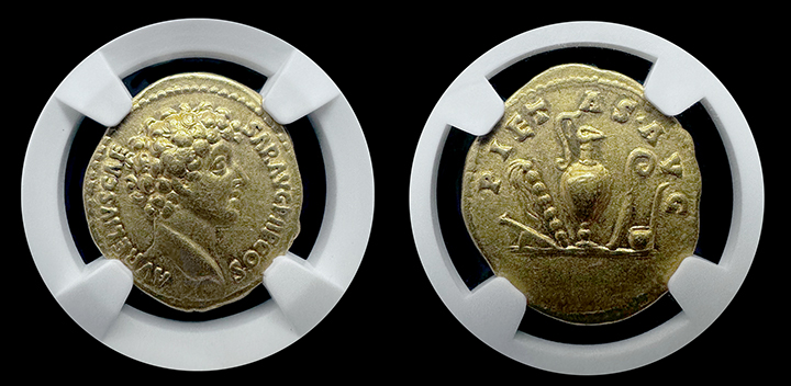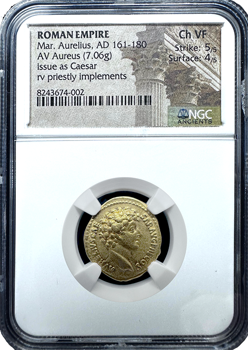 NGC has certified this piece as Choice Very Fine, with a remarkable 5/5 strike and surfaces graded 4/5. The sharpness of detail and its overall preservation make it an outstanding example of Marcus’ coinage as Caesar.
