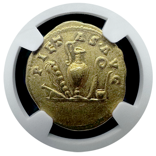 This gold aureus was struck when Marcus Aurelius still held the title of Caesar, before rising to the purple as emperor. Known to history as the “Philosopher King,” Marcus combined military leadership with Stoic wisdom, leaving a legacy unmatched among Rome’s rulers.