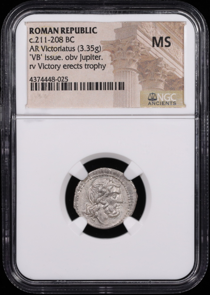 Stunning and frosty mint state silver “Victoriatus”, issued from 211 – 208 B.C. depicting a lifelike portrait of Jupiter on the obverse and a procession of victory on the back.