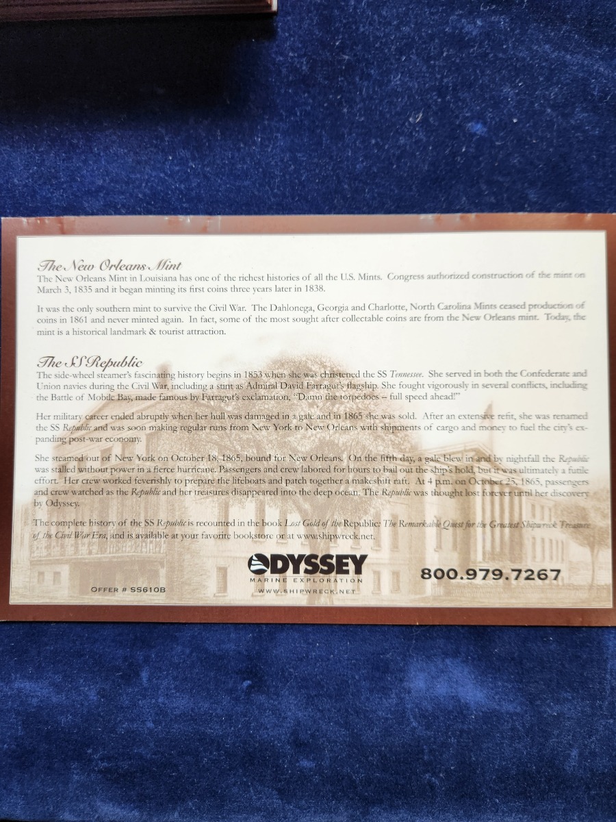 Coin pictured is the exact coin you will receive and it will come with an original SS Republic wooden box along with a large certificate of authenticity and a DVD describing the recovery efforts. This is a remarkable find that we are proud to offer. Only one available.