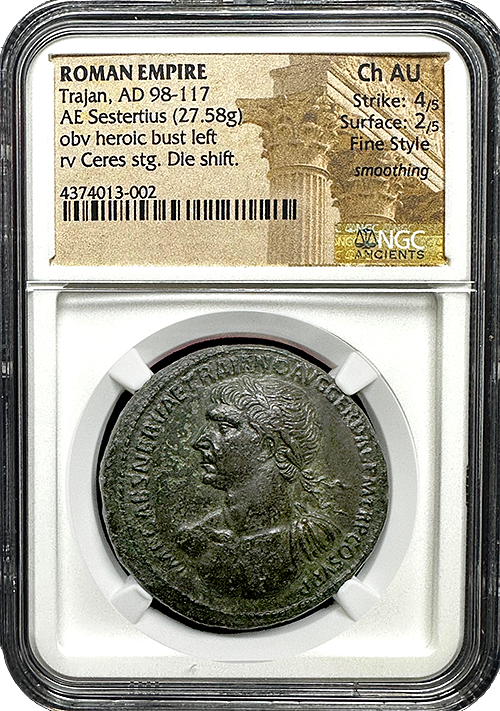 The Roman Empire Trajan Sestertius is a fascinating relic from the reign of one of Rome’s most accomplished emperors. This impressive bronze coin, graded as Choice About Uncirculated by NGC Ancients, carries a Strike rating of 4/5 and a Surface rating of 2/5, reflecting both its fine craftsmanship and the passage of time that makes it a truly historic piece.