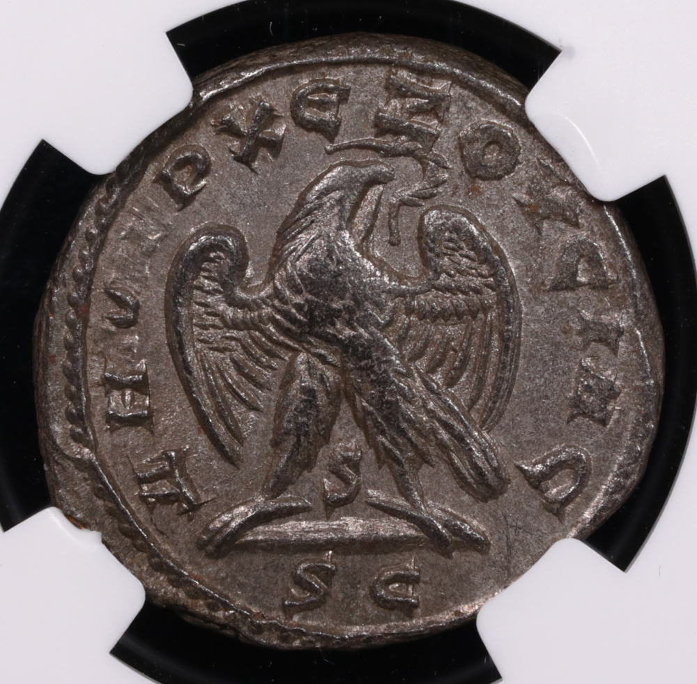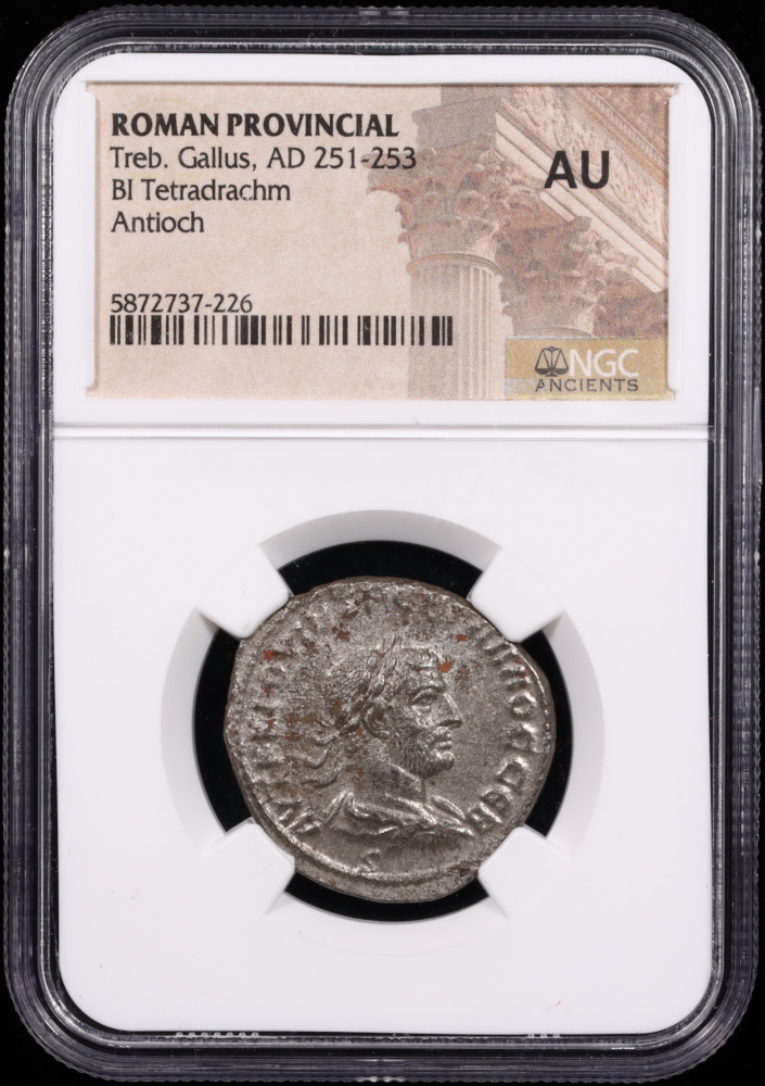 Condition and Rarity: Certified by NGC Ancients in About Uncirculated (AU) condition, this coin exhibits exceptional eye appeal with sharp details on both the obverse and reverse. The portrait of Trebonianus Gallus is well-defined, while the eagle on the reverse remains remarkably clear. Such high-grade examples of Tetradrachms from this period are rare, and the minimal wear on this coin further adds to its collectibility and value.