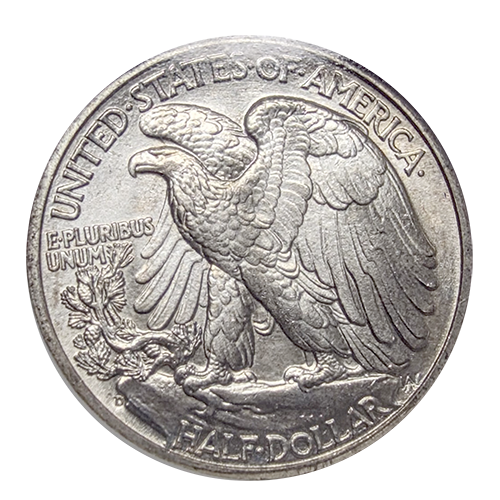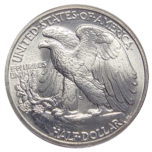 The reverse showcases a majestic American bald eagle perched on a rocky crag, wings partially spread, with a mountain pine growing from the rock—a representation of resilience and independence. The detailed craftsmanship of this design, along with the inscriptions "UNITED STATES OF AMERICA," "E PLURIBUS UNUM," and "HALF DOLLAR," highlight the artistic brilliance of Weinman’s work.